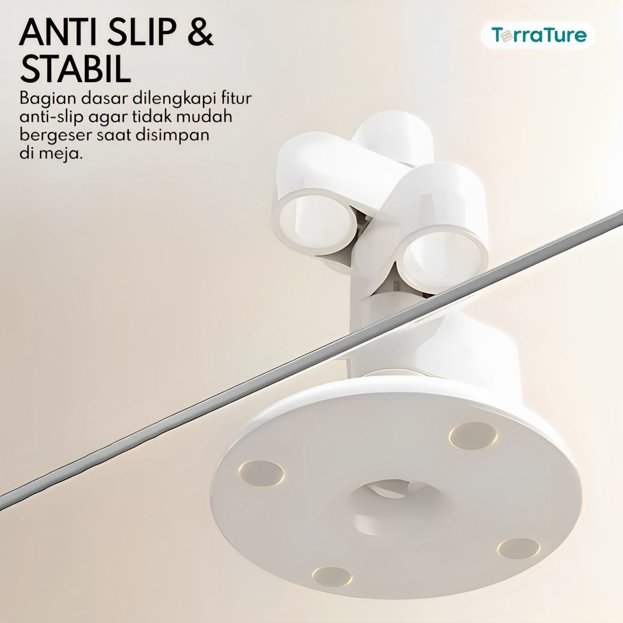 Bagian dasar dilengkapi fitur anti-slip agar tidak mudah bergeser saat disimpan dimeja