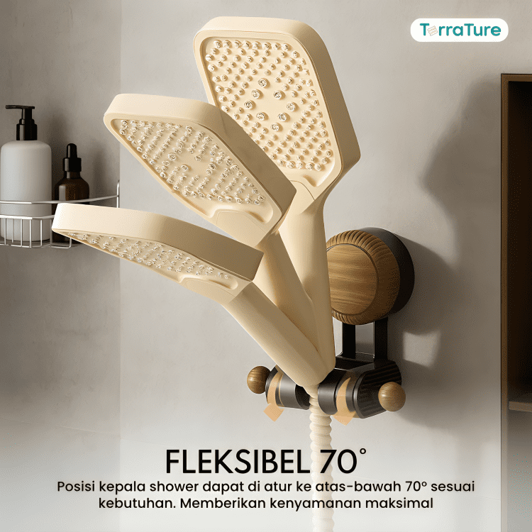 Posisi kepala shower dapat di atur ke atas-bawah 70° sesuai kebutuhan. Memberikan kenyamanan maksimal